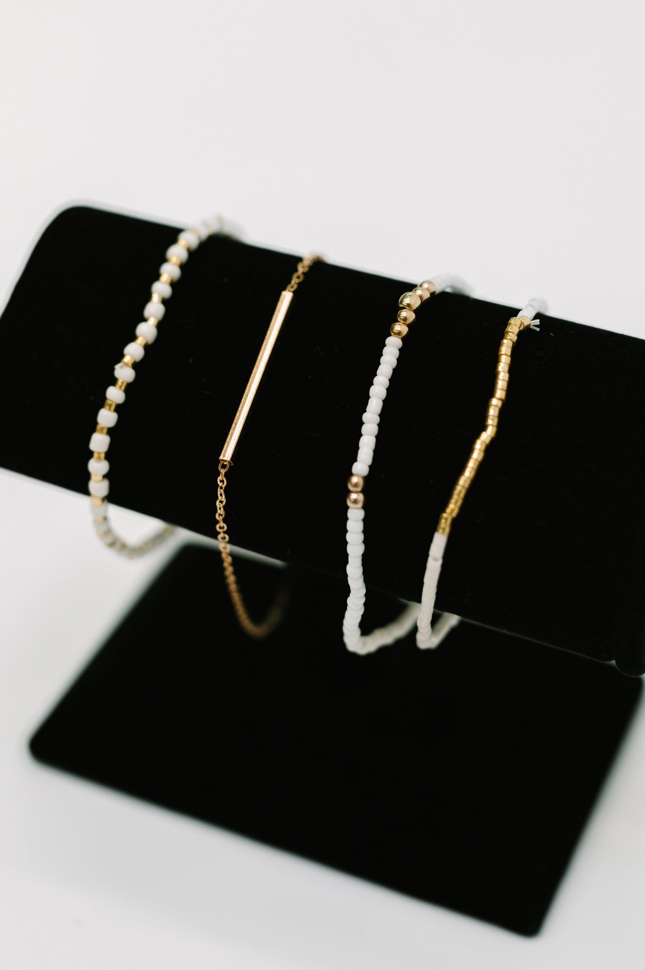 Add a touch of fun and elegance to your wrist with this playful Poised & Polished Bracelet Set in White and Gold. Three stretchy beaded bracelets mixed with a chic chain featuring a bar pendant offer effortless layering that fits most wrists. The crisp white beads paired with shiny gold accents bring a fresh, polished vibe perfect for everyday wear or a casual night out.