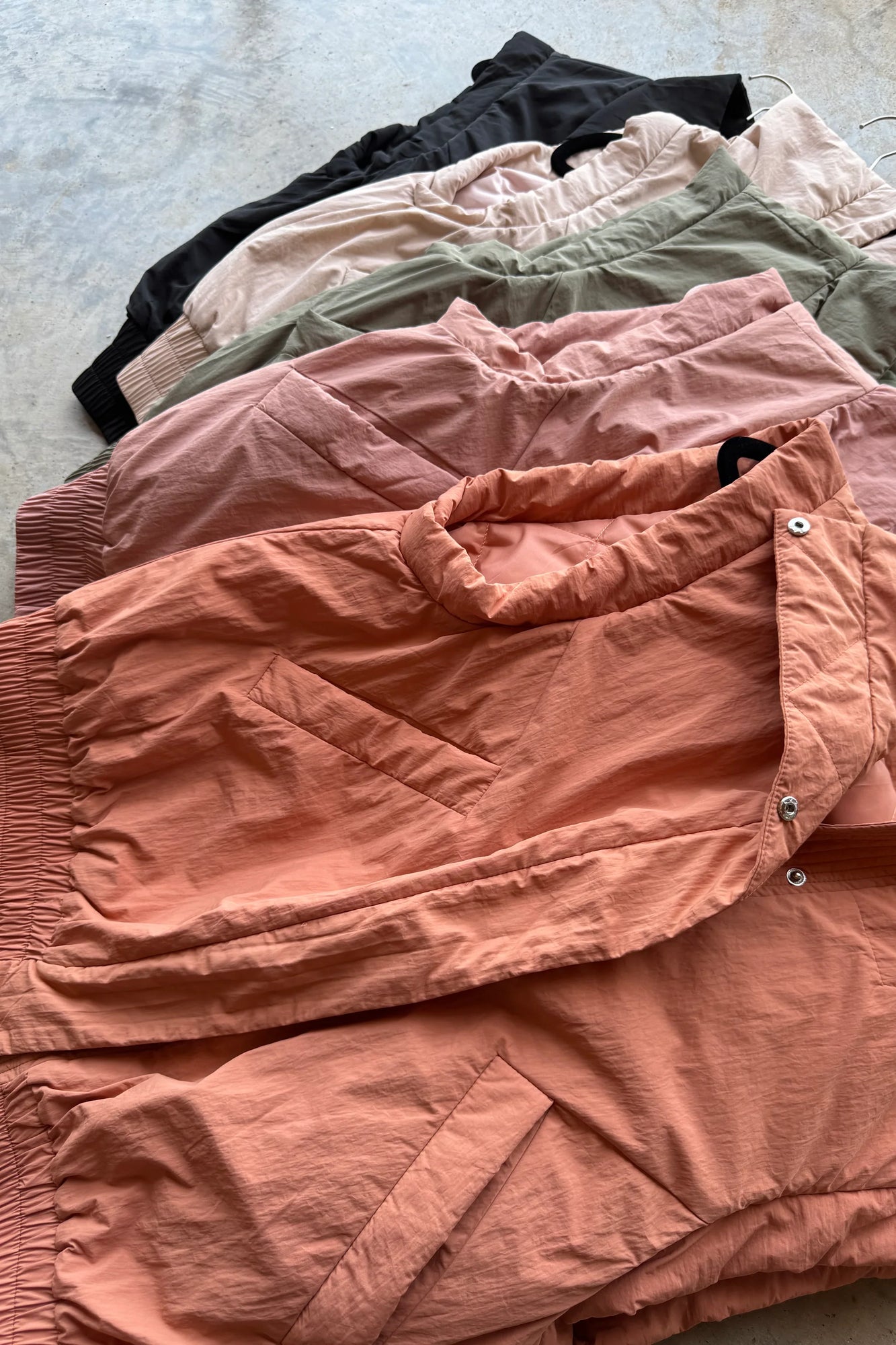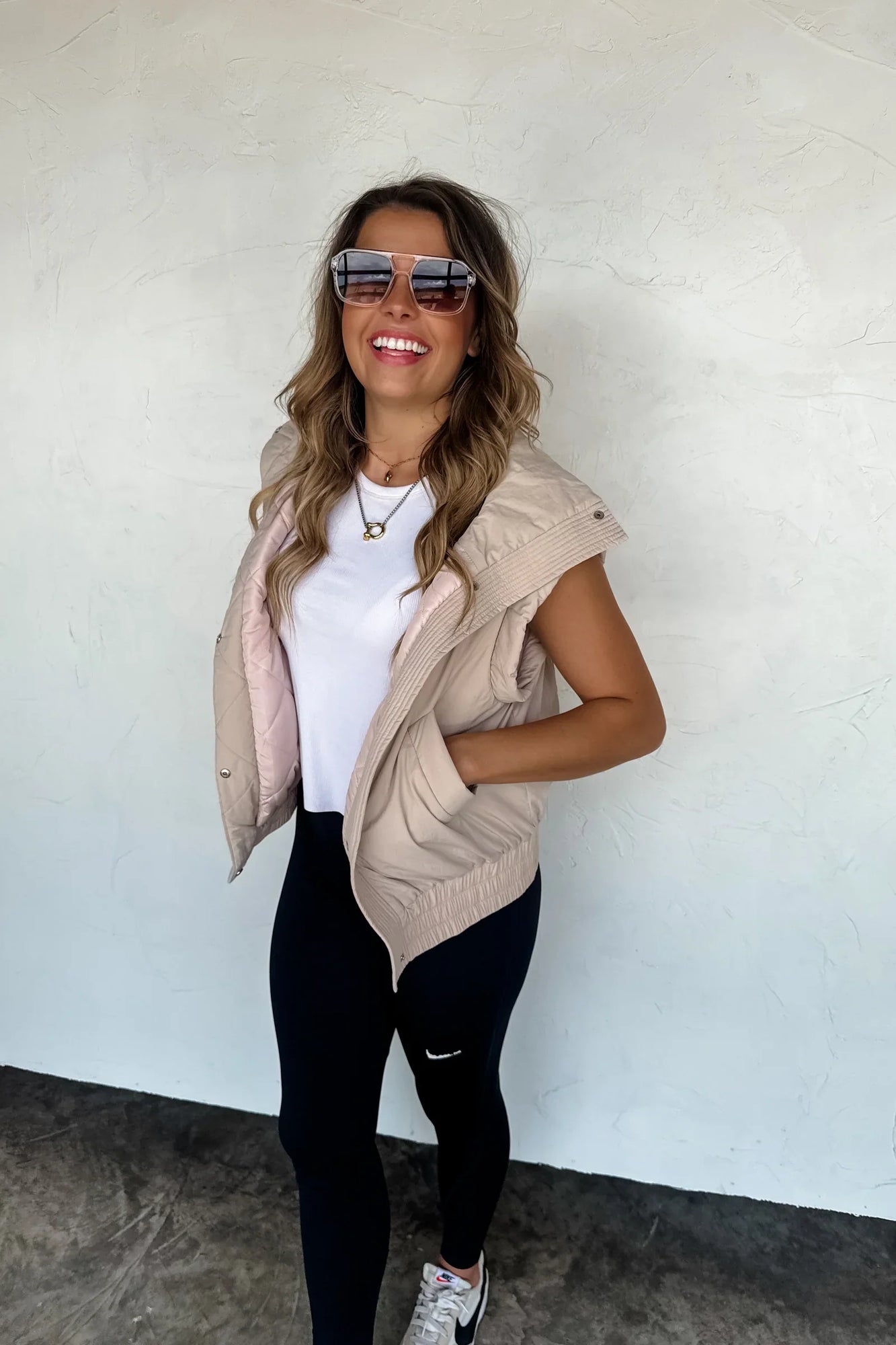 This lightweight vest features a structured silhouette with subtle quilting and a mock neckline for a modern edge. Designed with wide armholes, it layers effortlessly over any outfit without adding bulk. Includes a zipper closure and snap buttons for added functionality while maintaining its clean, minimal look. A closet staple for transitional weather and easy layering.