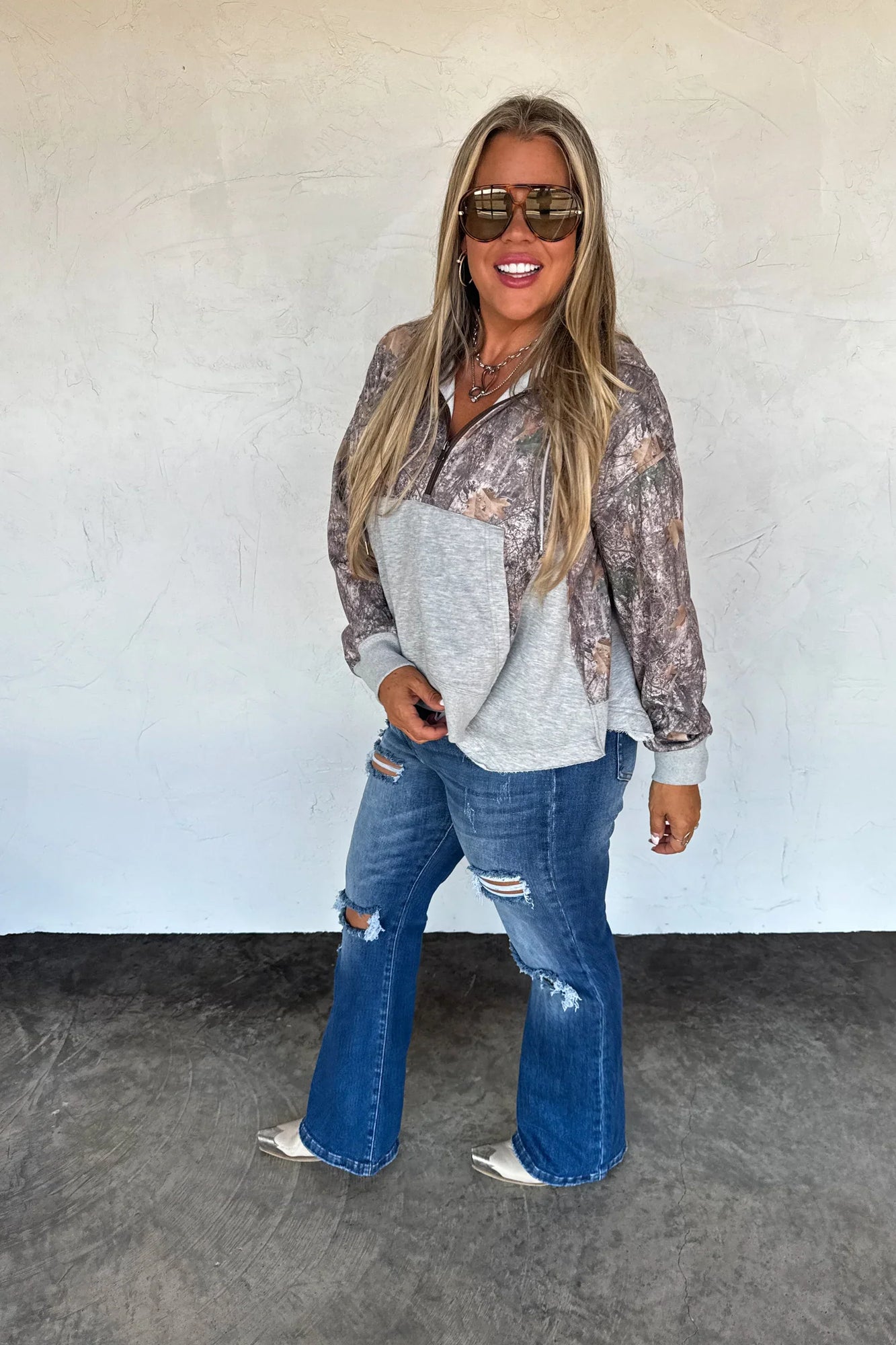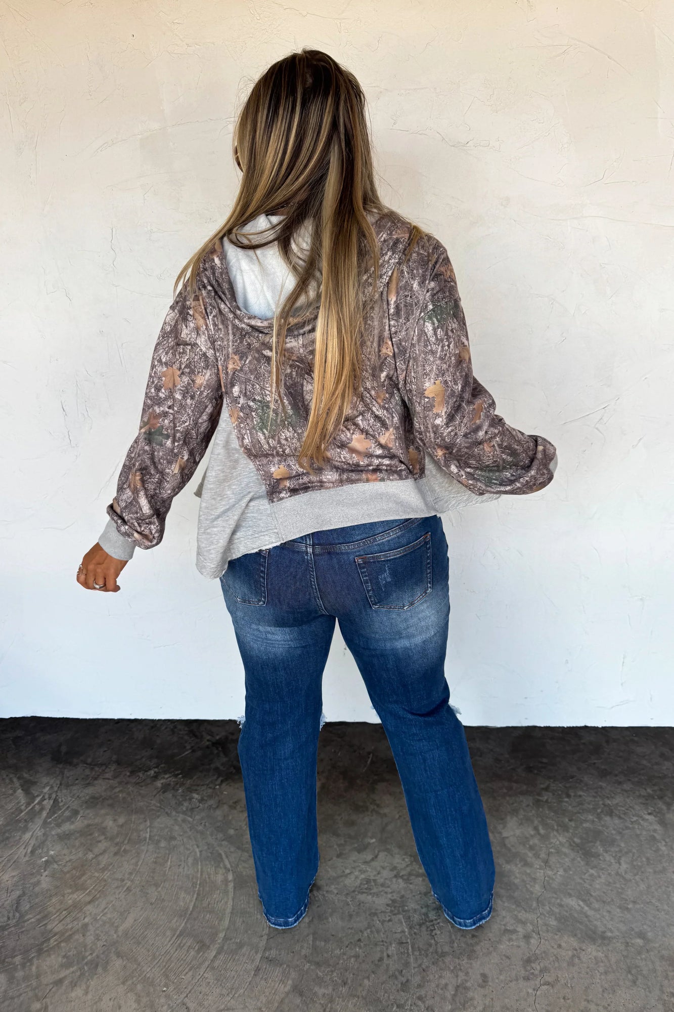 This half-zip hoodie pullover features a relaxed, swing-style fit. With a super soft texture, roomy hood, kangaroo pockets, and an easy half-zip neckline, it’s the perfect throw-on layer for effortless everyday style.