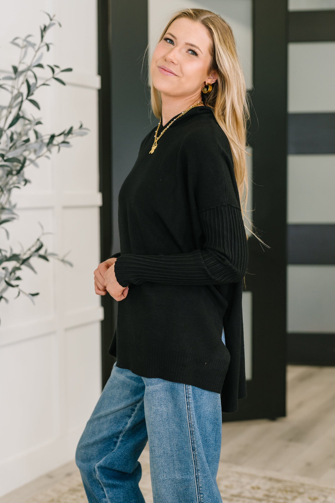 Stay cozy and stylish with the Running Late Hooded Long Sleeve in Black. This playful piece features a high-stretch ribbed knit that moves with you, while drop shoulders and thick ribbed sleeves add a trendy, relaxed vibe. The raw sleeve cuffs and side slits bring an effortlessly cool, undone look, finished with a ribbed hemline for a snug fit. Perfect for those busy days when you're fashionably running late!